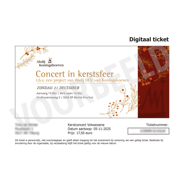 Na ontvangst van uw betaling stuurt Abdij Koningshoeven de kaarten per post naar u toe. De kaarten kosten ⬠17,50 per stuk voor volwassenen en ⬠6,00 per stuk voor kinderen tot 16 jaar. (Consumptiebonnen à ⬠1,50 zijn alleen verkrijgbaar in de Kloosterwinkel)